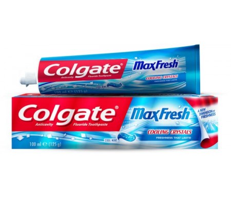 Colgate Max Fresh toothpaste with cooling crystals, Cool Mint flavor, 100ml tube and 125g packaging for long-lasting freshness.